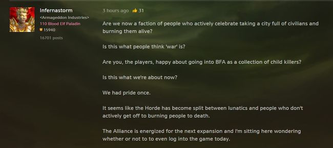 Недавний ивент, предшествующий выходу Битвы за Азерот, продемонстрировал нам невероятный накал страстей и, надо сказать, что большая часть комьюнити World of Warcraft была не слишком-то рада. Вторая часть Войны Шипов запустила маховик войны между Альянсом и Ордой, однако последние в этом противостоянии оказались явным злодеями. Что думают обычные игроки о сожжении древа Тельдрассила, новой Сильване, "демонизации" Орды и других поворотов сюжета WoW?