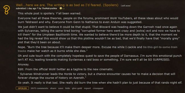 Игроки решили, что это значит, что несмотря на то, что в прологе Орда занималась сомнительными делами, позже игрокам дали бы некую информацию, которая позволила бы сопереживать представителям этой фракции. Но после месяцев ожидания, в действиях Сильваны и Орды остается все меньше "серости". Сожжение Тельдрассила и убийство множества невиновных ночных эльфов не стало какой-то моральной дилеммой, которую стоит обсуждать. Это стало проявлением самого настоящего зла.